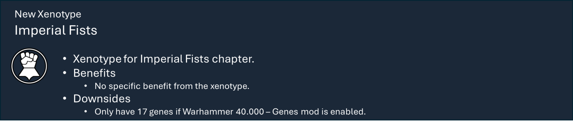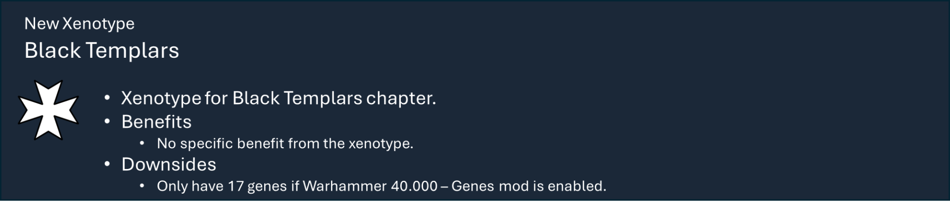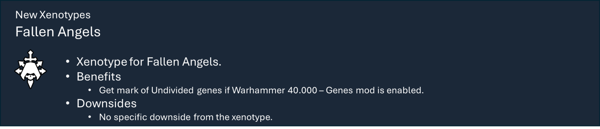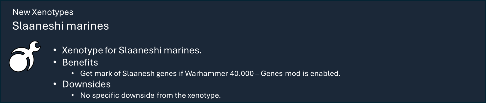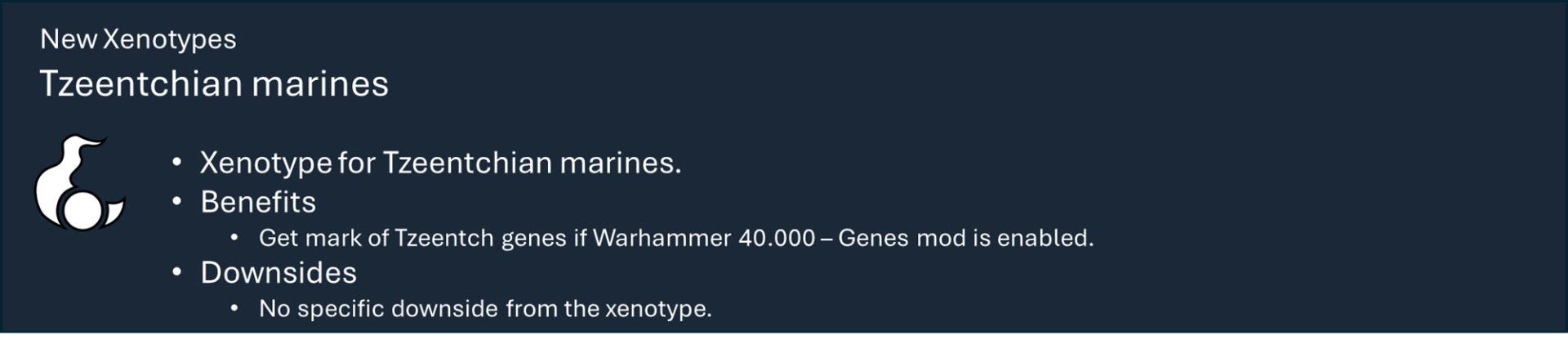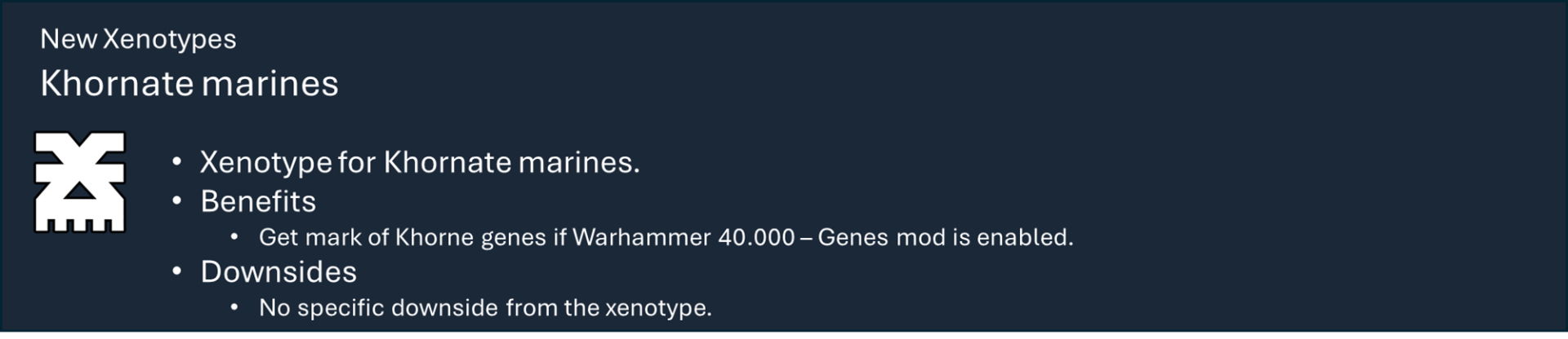 Это основная библиотека моих тематических наборов модов для Warhammer 40k. Сам по себе этот мод не предоставляет вам никаких функций, но содержит большую часть кода, который обеспечивает работу игрового механизма каждой фракции.