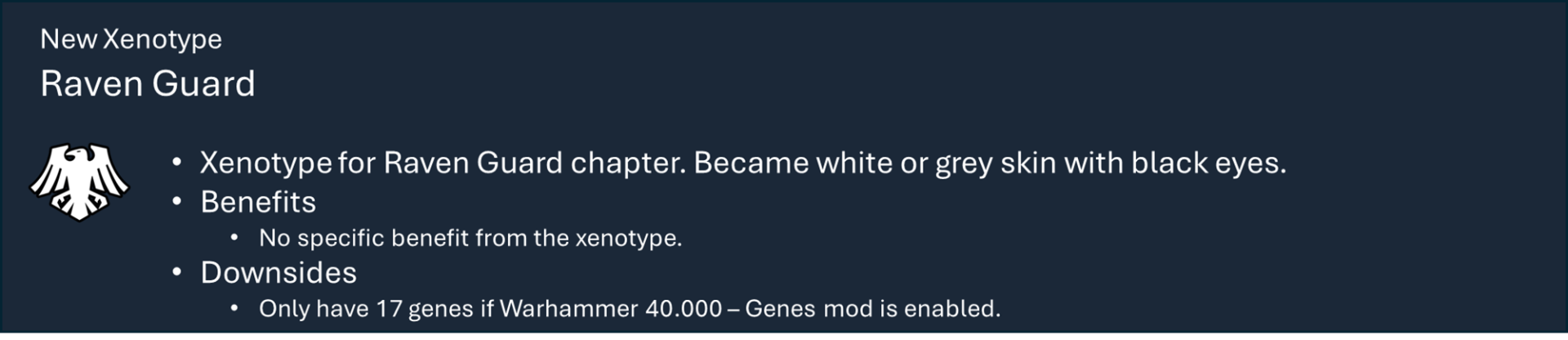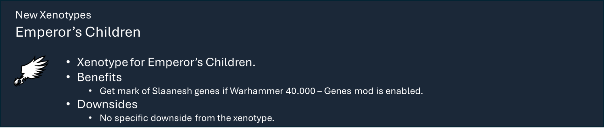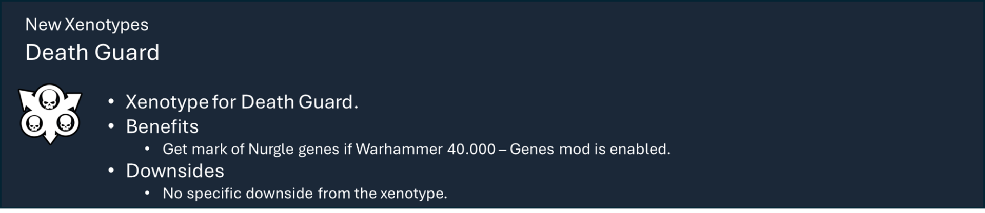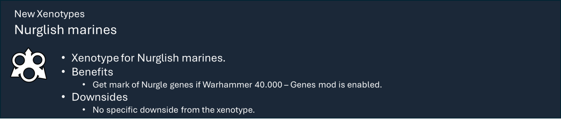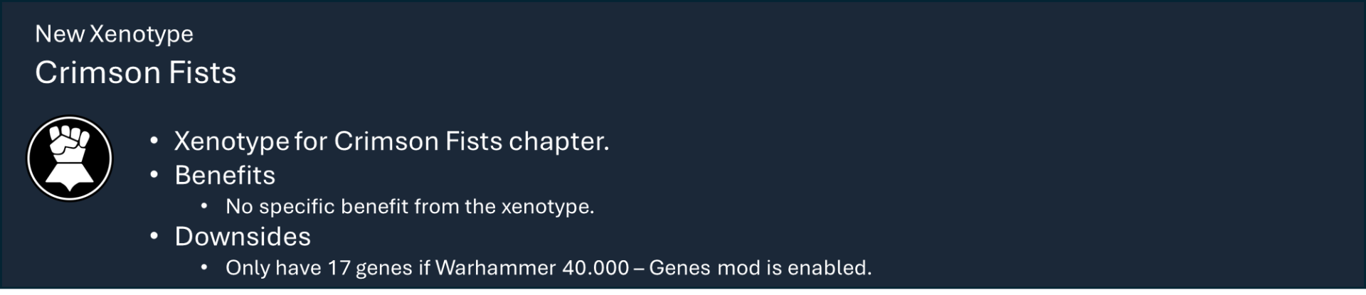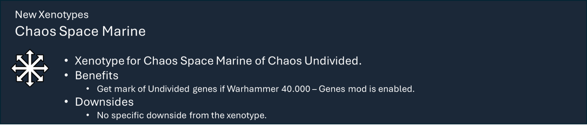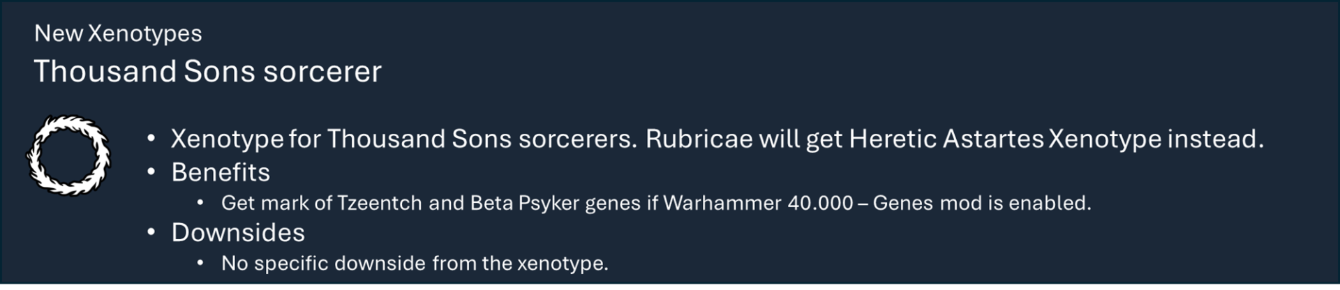 Это основная библиотека моих тематических наборов модов для Warhammer 40k. Сам по себе этот мод не предоставляет вам никаких функций, но содержит большую часть кода, который обеспечивает работу игрового механизма каждой фракции.