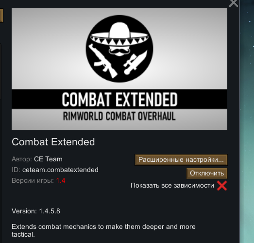 Кому хочется пошпилить в римку 1.6 с Combat Expanded, вот ссылка на Github, я играю, всё вполне стабильно. Однако не стоит исключать вероятности багов хаго вагов. github.com/CombatExtended-Continued/CombatExtended/issues/608