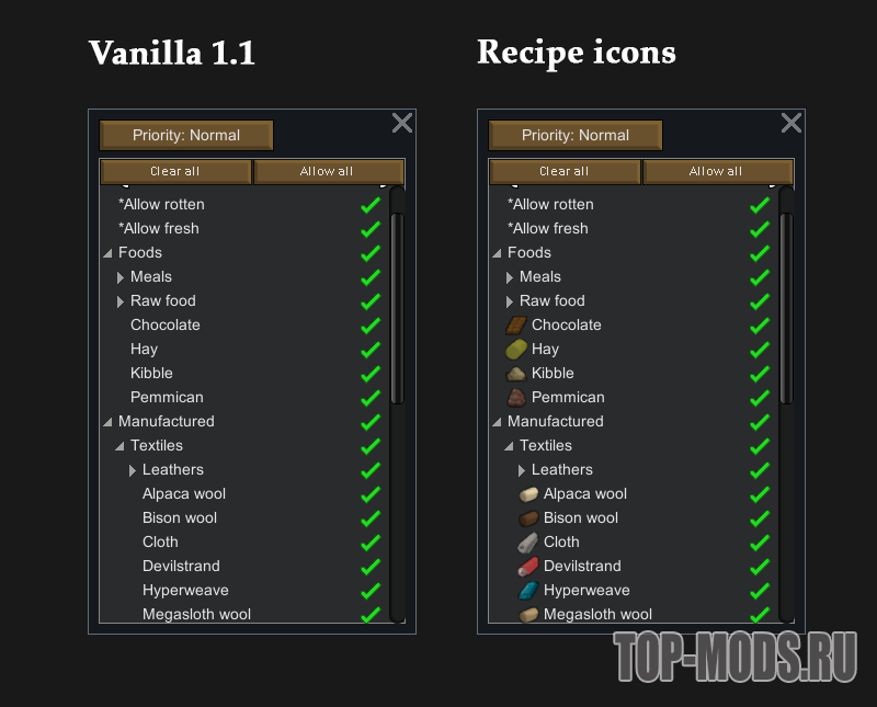 Мод Recipe icons для Rimworld — добавляет иконки предметов в название рецептов для крафта. Работает с другими модами.