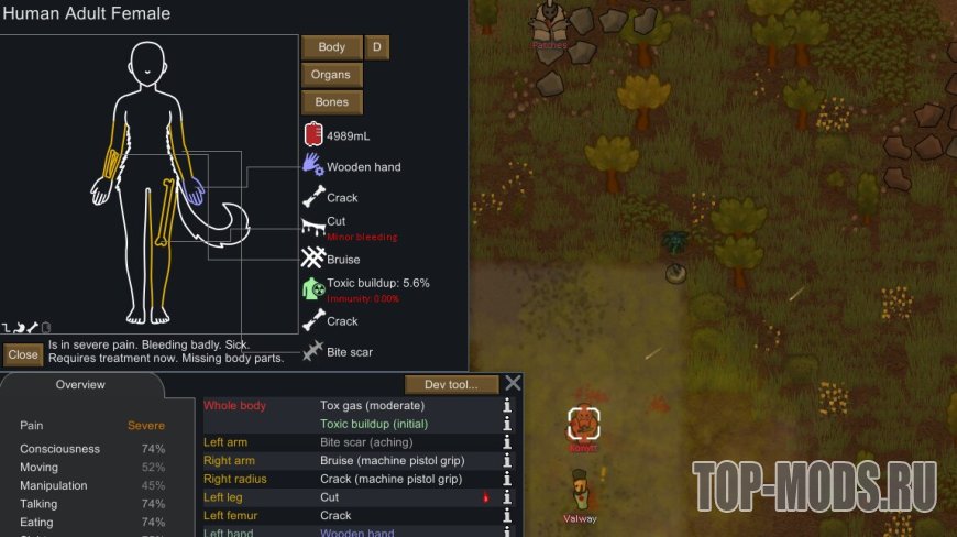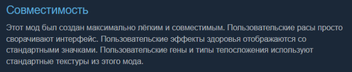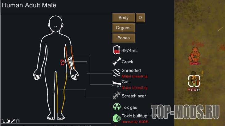 Обеспечивает более наглядный и интересный интерфейс поверх вкладки «Здоровье», позволяя визуально отслеживать состояние ваших колонистов, животных и механоидов.