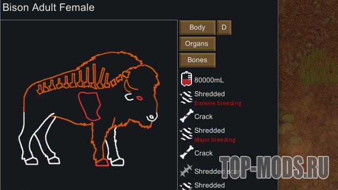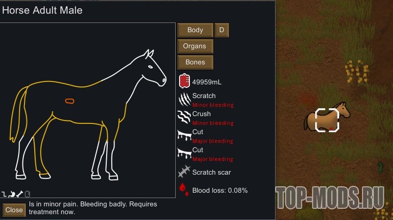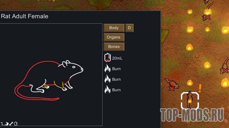 Интерфейс разработан таким образом, чтобы он был лёгким и соответствовал тематике интерфейса и животных Rimworld. Он не заменяет основную вкладку «Здоровье» и может быть свёрнут в любой момент.
