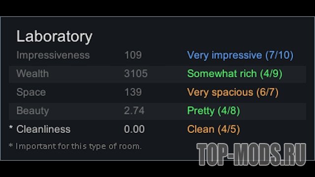 Данный мод меняет цвет характеристик комнаты в зависимости от качества. В скобках отображается текущий и максимальный уровень качества.
