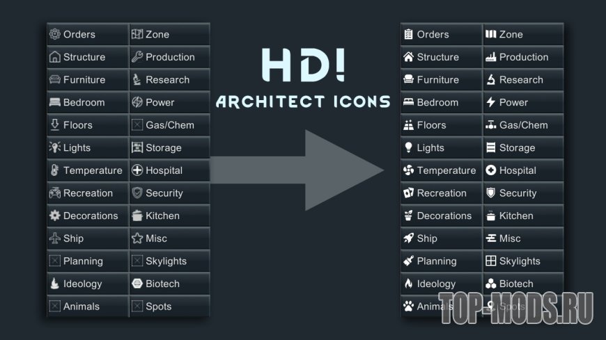 Предоставляет гораздо более четкие и подробные иконки для каждой вкладки в HD для мода Architect Icons.