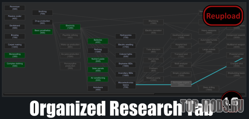 Когда вы используете моды, добавляющие исследовательские проекты, ваша вкладка «Исследования» захламляется, а некоторые проекты иногда оказываются вне зоны видимости. Этот мод предлагает решение данной проблемы.