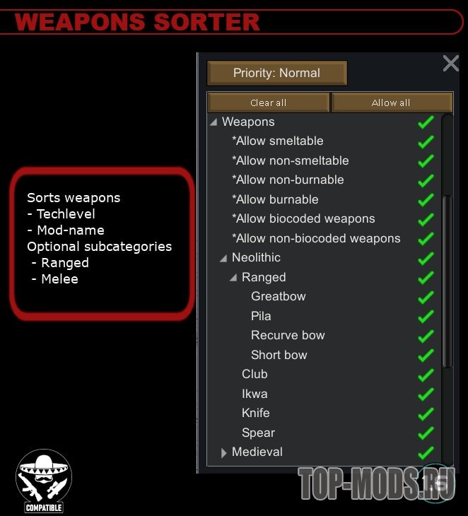 Удобный мод для сортировки вашего оружия. Позволяет сортировать вооружение по названию, техническому уровню, разделять на подкатегории и многое другое. Работает как с ванильным, так и с модовым оружием.