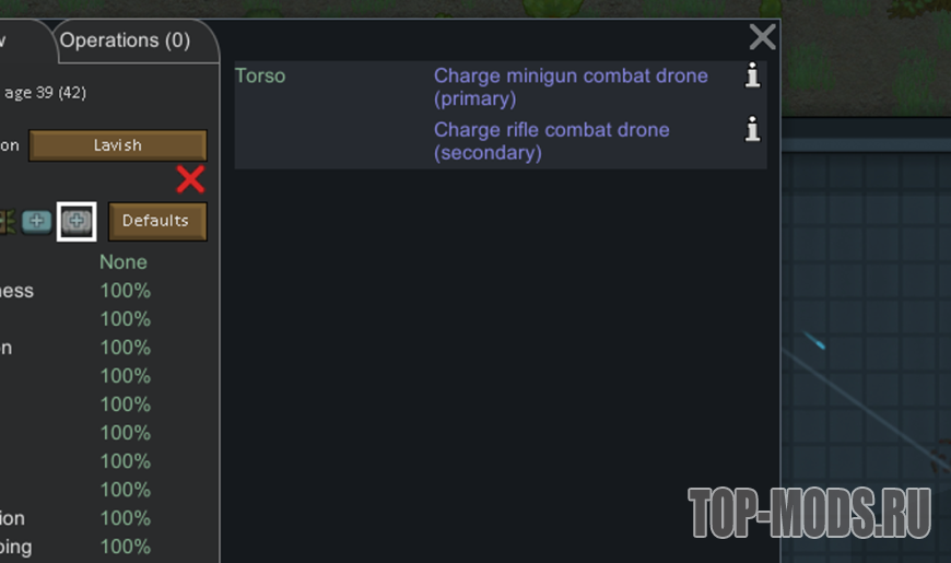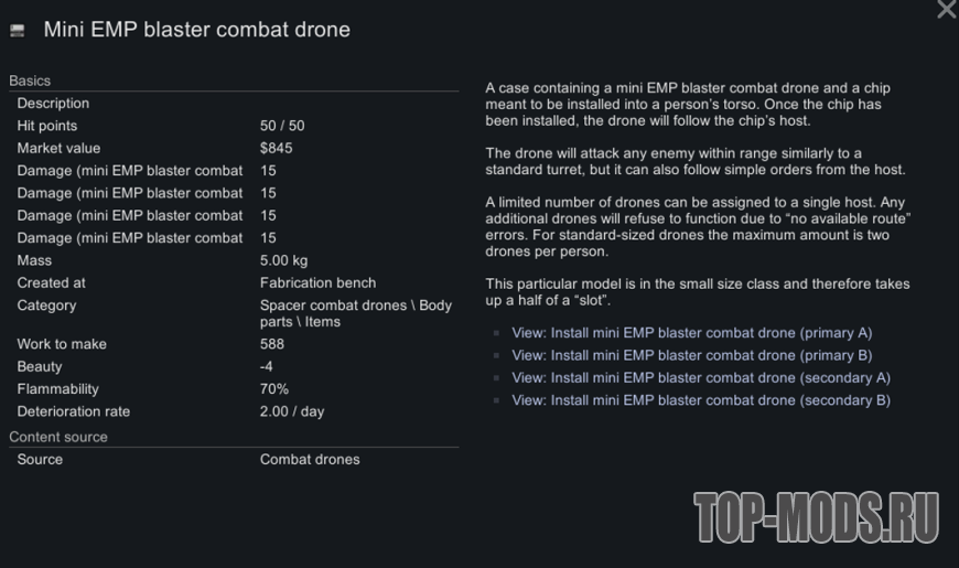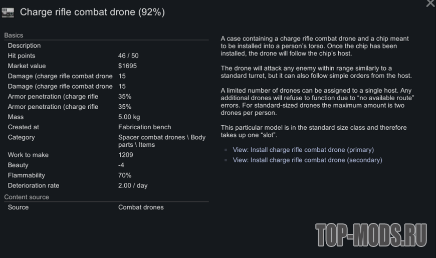 Этот мод добавляет боевых дронов, которые в значительной степени функционируют как мобильные турели, приклеенные к пешке. Представьте себе мод Vanilla Apparel Expanded — Accessories’ Mini-turret Pack, он работает практически так же, за исключением того, что он поставляется в виде имплантата, а не одежды.