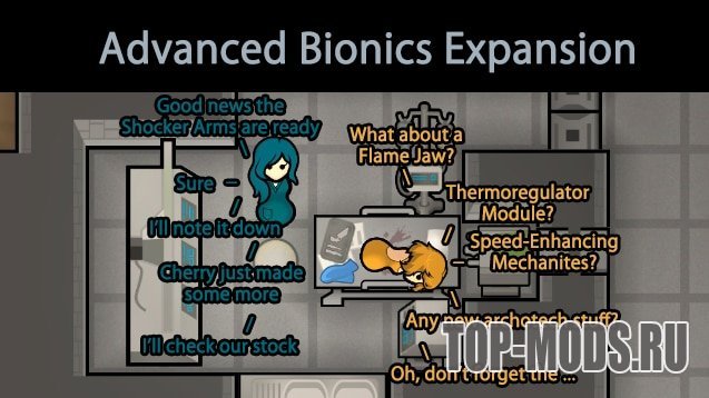 Этот мод включает мой другой мод Vanilla Bionics Expansion, который заполняет все недостающие ванильные протезы, бионику и архотек, поэтому он не требуется. Этот мод расширяет возможности обычной ванильной бионики. Он добавляет новый набор продвинутых биониклов с эффективностью 150% и несколько различных имплантатов, которые могут быть установлены в различных местах. Для их создания необходимо исследовать новые сверхтехнологичные исследовательские проекты (если у вас есть королевская власть, требуются технологические отпечатки). Продвинутые бионики обычно стоят вдвое дороже обычных аналогов.