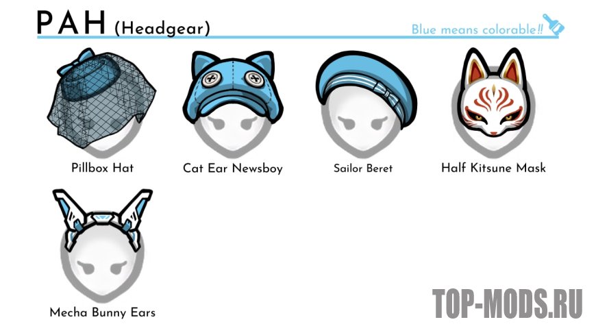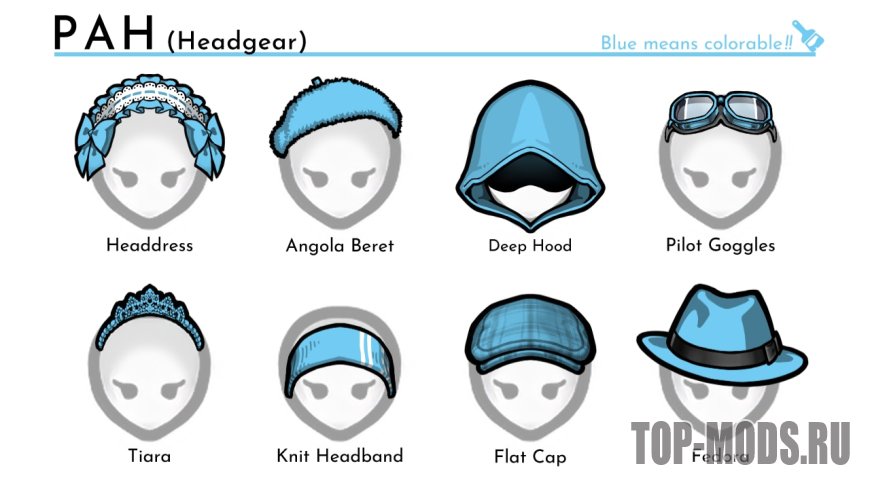 Предметы типа шляпы. Значения установлены на основе стандартного снаряжения. Точные характеристики см. в описаниях предметов в игре.
