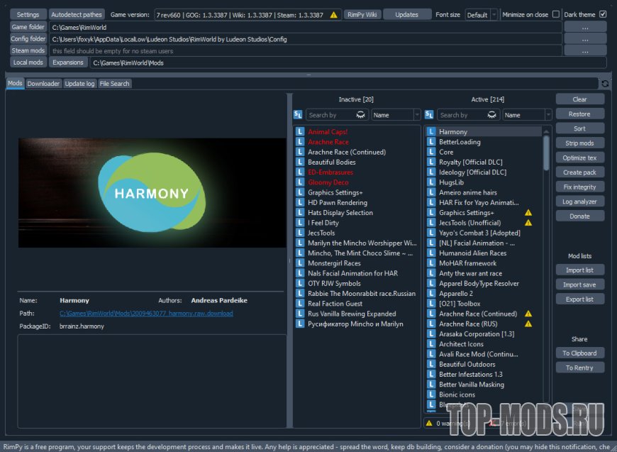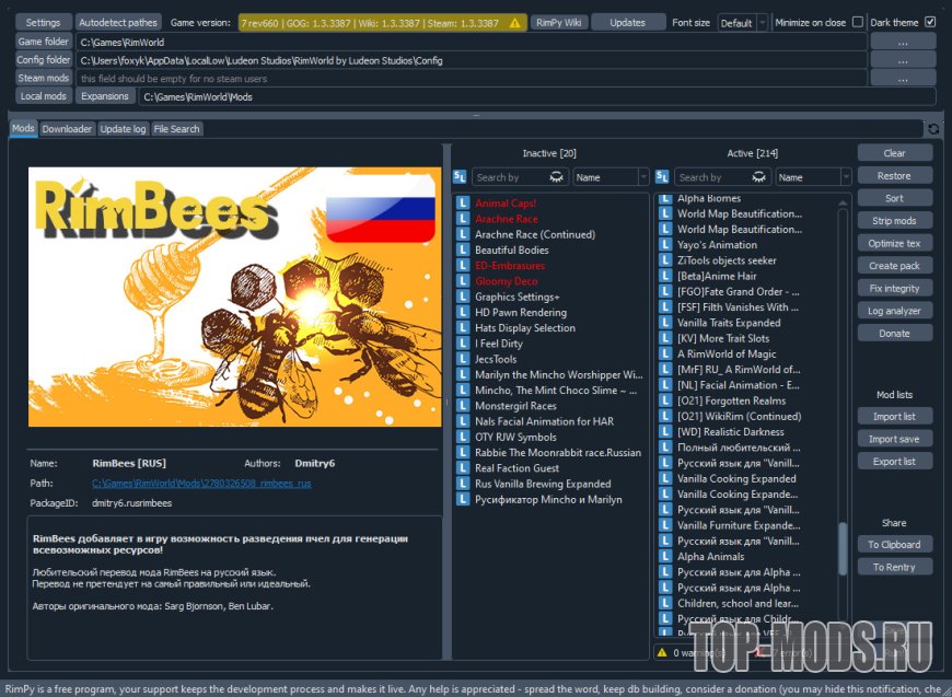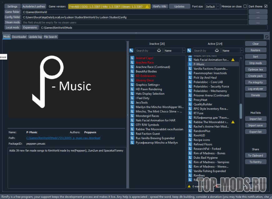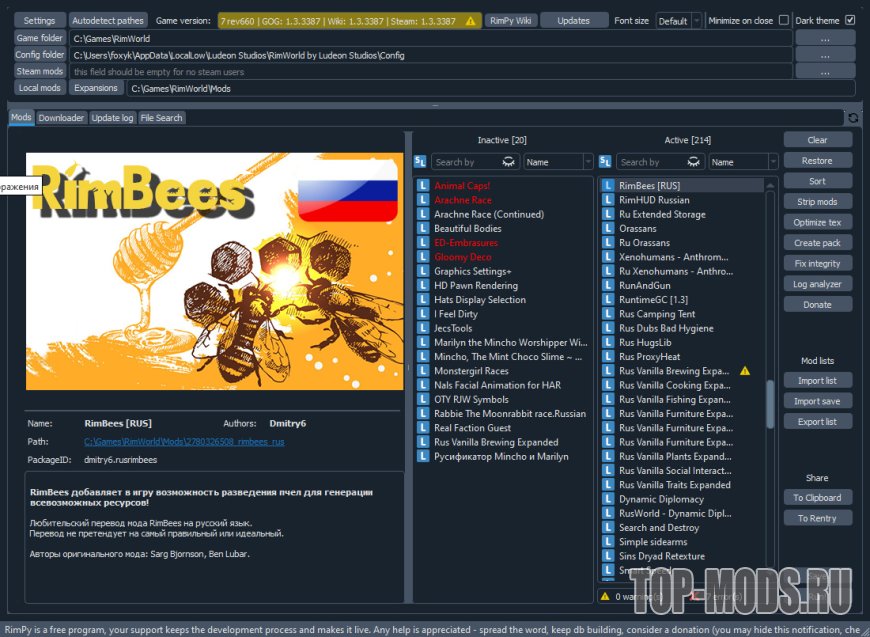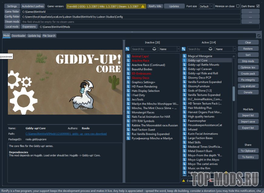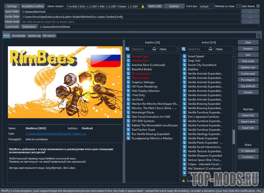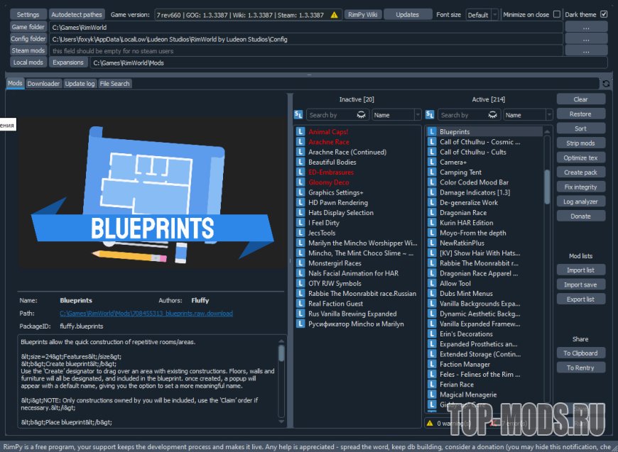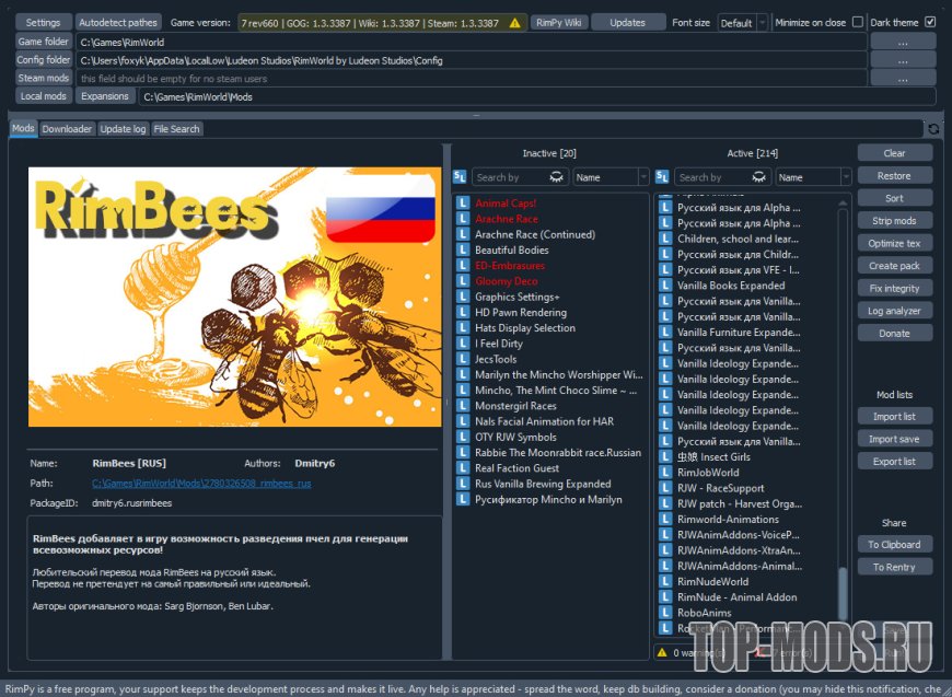 Соре может я тупой и чего то не шарю но, можно более подробную инструкцию установки а то, скачиваешь 4 папочки и если папку Foxy Voxel и RimPy Mod Manager понятно что кидаем в /Appdata/LocalLow. То хули делать с папкой «RimWorld» и «rimworld mod manadger», не совсем понятно. Являеться ли папка RimWorld уже готовым римычем или содержимое этой папки нужно закинуть в уже установленый рим ворлд не понятно. И куда пихать rimworld mod manadger ?