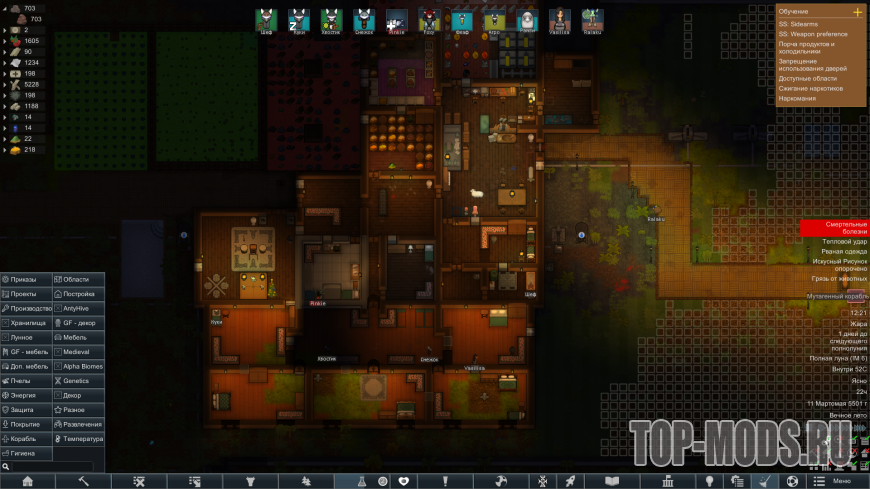 Добавила QoL моды: DubsMintMinimap, no_zzz, hunt_for_me, show_draftees_weapon, KV Save Storage Outfit Crafting Drug & Operation Settings (сохраняет настройки складов, операций и прочего), RimFridge, Temperature Control Unit, InventoryTab, Wall_Light, Quarry. Без этого играть было довольно неудобно. На расах кошек и прочих фурри почему-то не работают операции по добавлению бионических частей тела, хотя в инвентаре протезы есть… UPD: Feles убрала совсем, чудовищная частота спавна, пешек-людей найти практически невозможно.