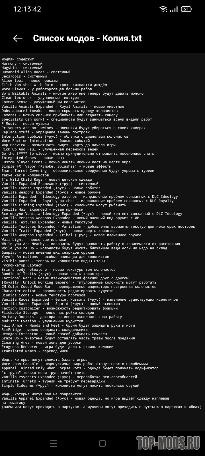 Всего 97 модов (почти все на русском). Модпак состоит примерно на 60% из балансных/улучшающих модов; на 40% из модов, дополняющих какой-либо аспект игры; на 10% из модов с новым контентом. Есть несколько модов для модификаций пешек, фракций и подобного. Присутствуют модификации на графику.