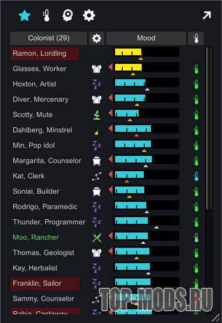 Moody для Rimworld — добавляет информационную панель, которая показывает много факторов относительно колонистов. Есть 4 вкладки для просмотра той или иной информации.