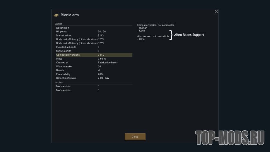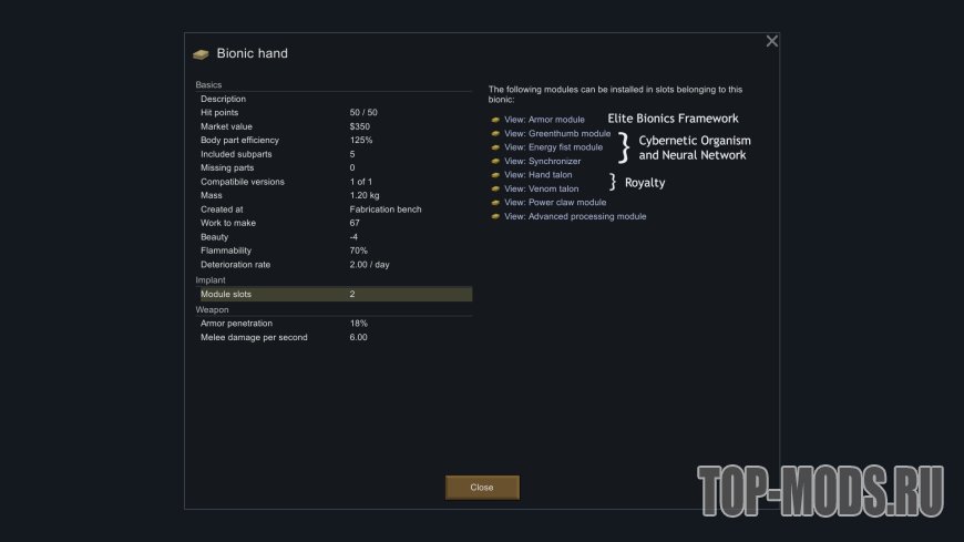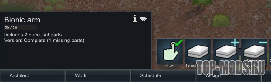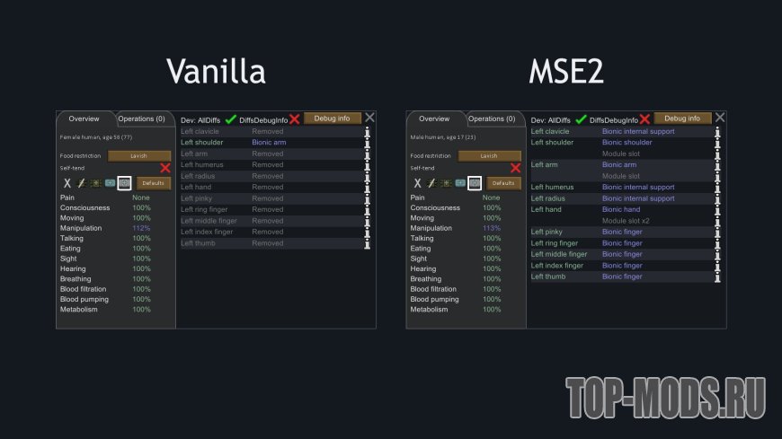 Улучшает то, как игра обрабатывает протезы, не отбрасывая части добавленных протезов. Это делает так, что добавление бионических частей не снижает общее здоровье пешки, а части могут быть повреждены.