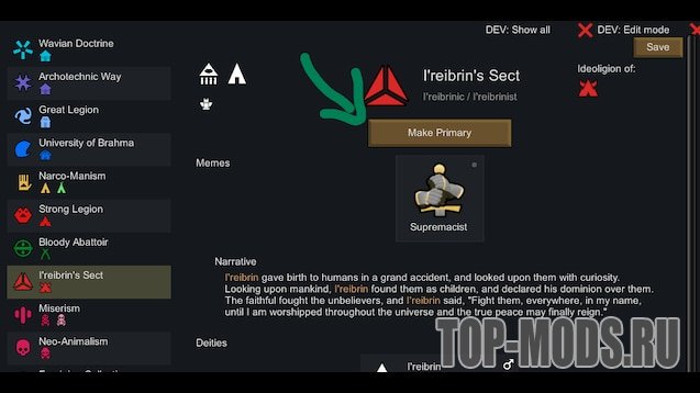 Этот мод просто добавляет большую кнопку на странице идеологии, чтобы установить вашу основную идеологию.