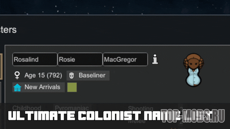 Лучший генератор имён для колонистов, содержащий сотни тысяч записей из нескольких стран, включая точные прозвища и уменьшительно-ласкательные формы, а также поддержку языков с гендерными фамилиями. Этот набор данных был создан благодаря бесчисленным часам работы с переписями населения и форматированию данных. Я люблю имена, и мне всегда хотелось, чтобы в игре был более интересный и разнообразный набор имён, но этому всегда мешала жёсткая западная система именования. Это моя попытка наконец-то заставить её работать так, как мне нравится, однако некоторые языки ещё не готовы из-за этого ограничения.