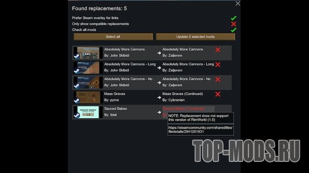 TLDR: Этот мод сканирует установленные вами моды и предлагает рабочие / более обновленные замены для этих модов