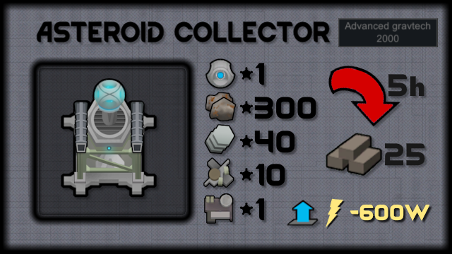Этот механизм собирает из космоса малые астероиды и создает из них блоки стеллита. Может быть построен только в открытом космосе.