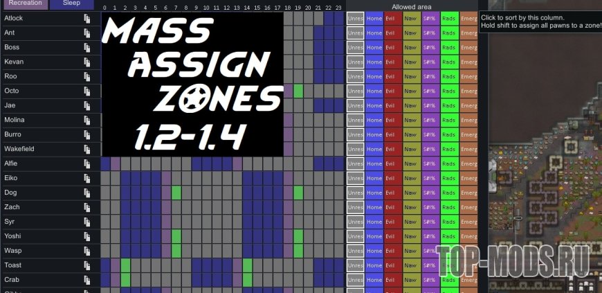 MAZ Mass Assign Zone — простой, но незаменимый мод для RimWorld, который избавляет от лишнего микроменеджмента. Он позволяет назначать зону сразу всем колонистам, животным или роботам одновременно, а не перекликивать каждого по отдельности. Просто удерживайте клавишу Shift и кликните по заголовку нужной зоны, чтобы мгновенно перевести туда всех пешек в списке. Это особенно полезно во время внезапных рейдов, когда нужно срочно спрятать всех жителей в безопасное место.