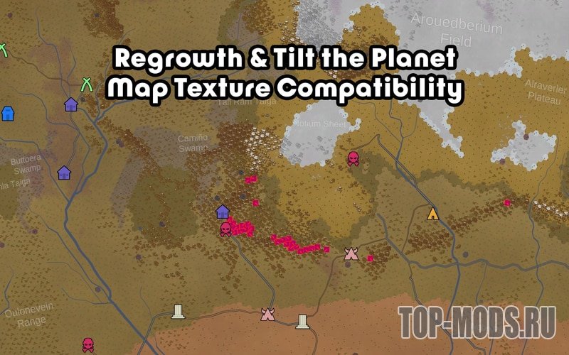 Мод Tilt the Planet размещает биомы в новых зонах (например, шрамящие земли в холодных горах или высокогорных степях), но встроенные текстуры карты из Regrowth не учитывают такие комбинации — из-за чего появляются ошибки (красные крестики).
