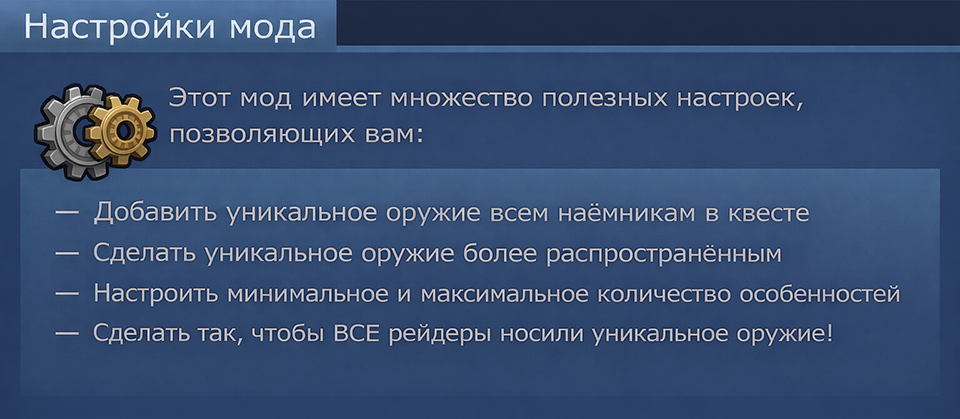 Добавляет ОЧЕНЬ много параметров мода для тонкой настройки вашего опыта взаимодействия с уникальным оружием.