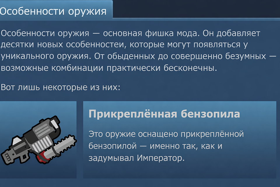 Добавляет около 100 новых оружейных черт — от обычных до совершенно безумных.