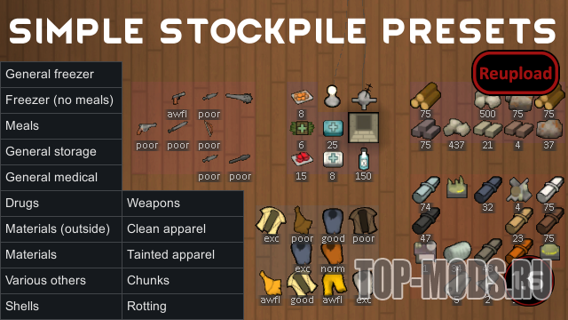 Мод, который добавляет различные пресеты для настроек складских зон в удобном всплывающем меню. Вы можете использовать их, чтобы легко настраивать часто используемые конфигурации хранения, как общие (например, для морозильников), так и специфические (например, еда, наркотики, оружие или чистая одежда).