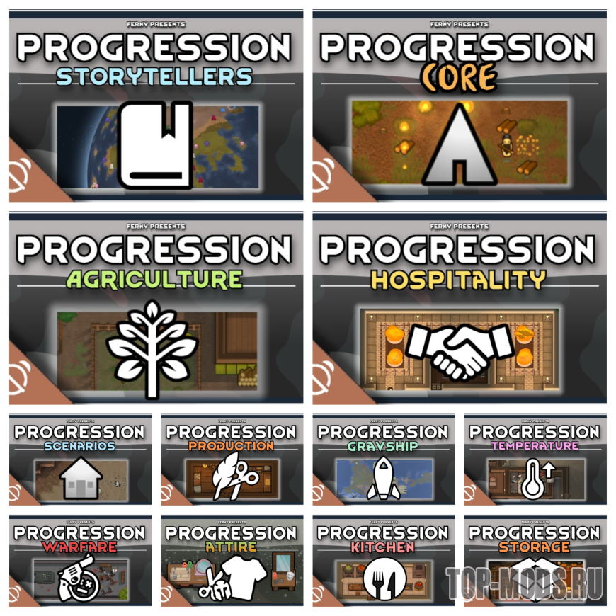 Данный русификатор охватывает всю экосистему модов Progression, значительно расширяющих и углубляющих игровые механики RimWorld.