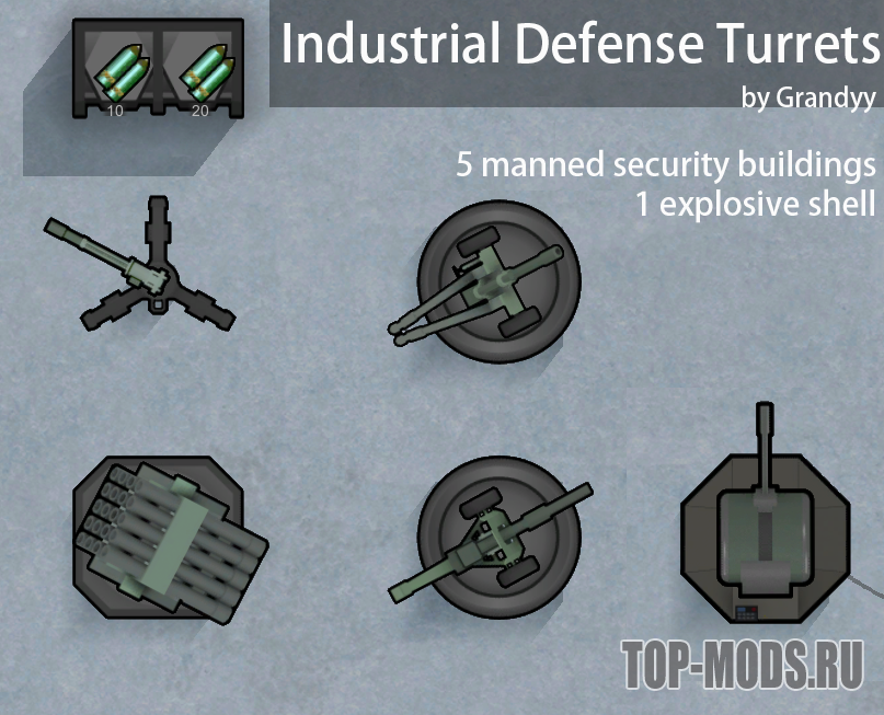 Добавляет 5 промышленных турелей и минометов, стреляющих разрывными снарядами или пулями.