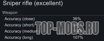 Этот мод позволяет оружию иметь точность более 100%. Однако точность выше 100 % подлежит убывающей отдаче: при 100 % требуется два очка точности, чтобы получить 1 % точности, а после 110 % требуется четыре очка точности.
