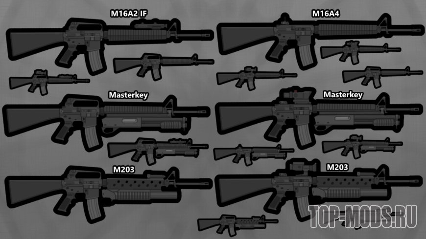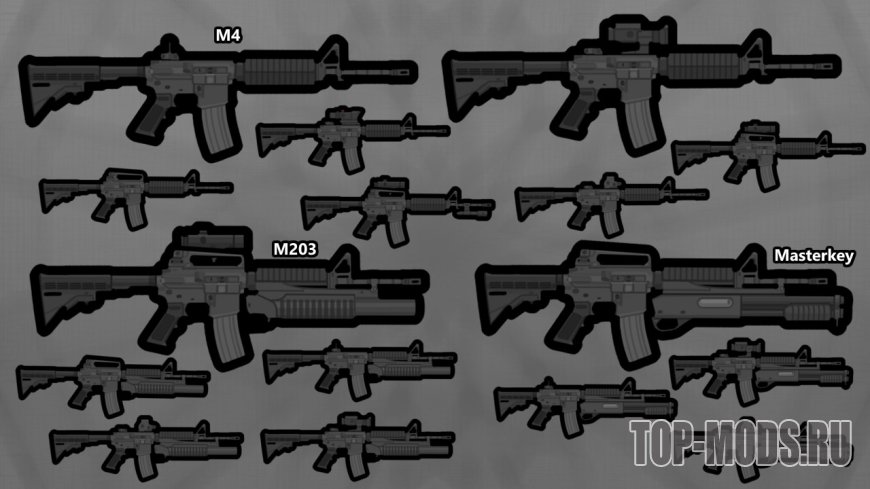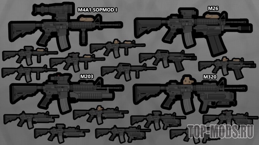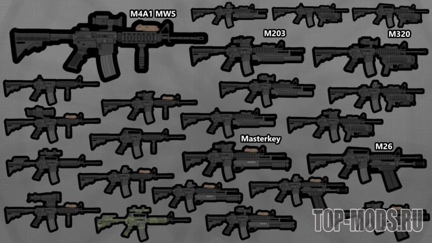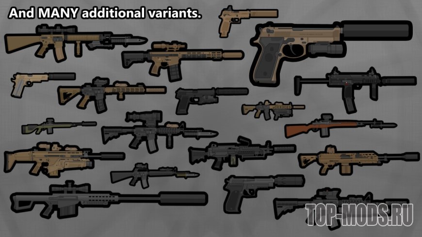 Многие виды оружия оснащены прикрепляемыми штыками, глушителями и складными прикладами.