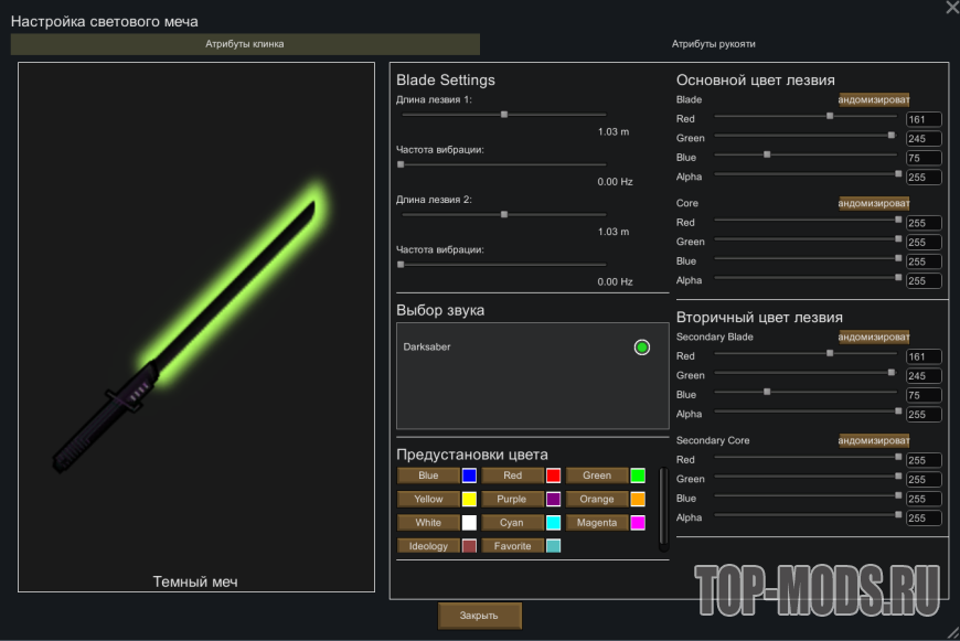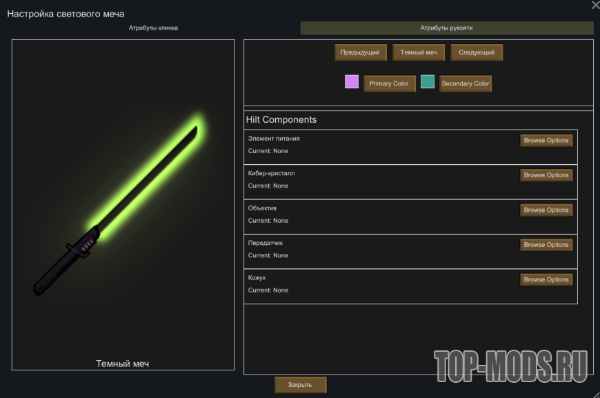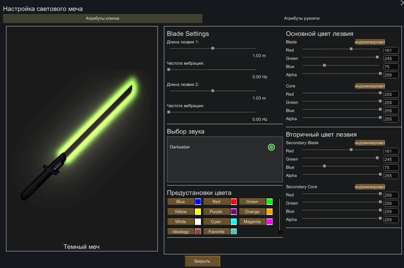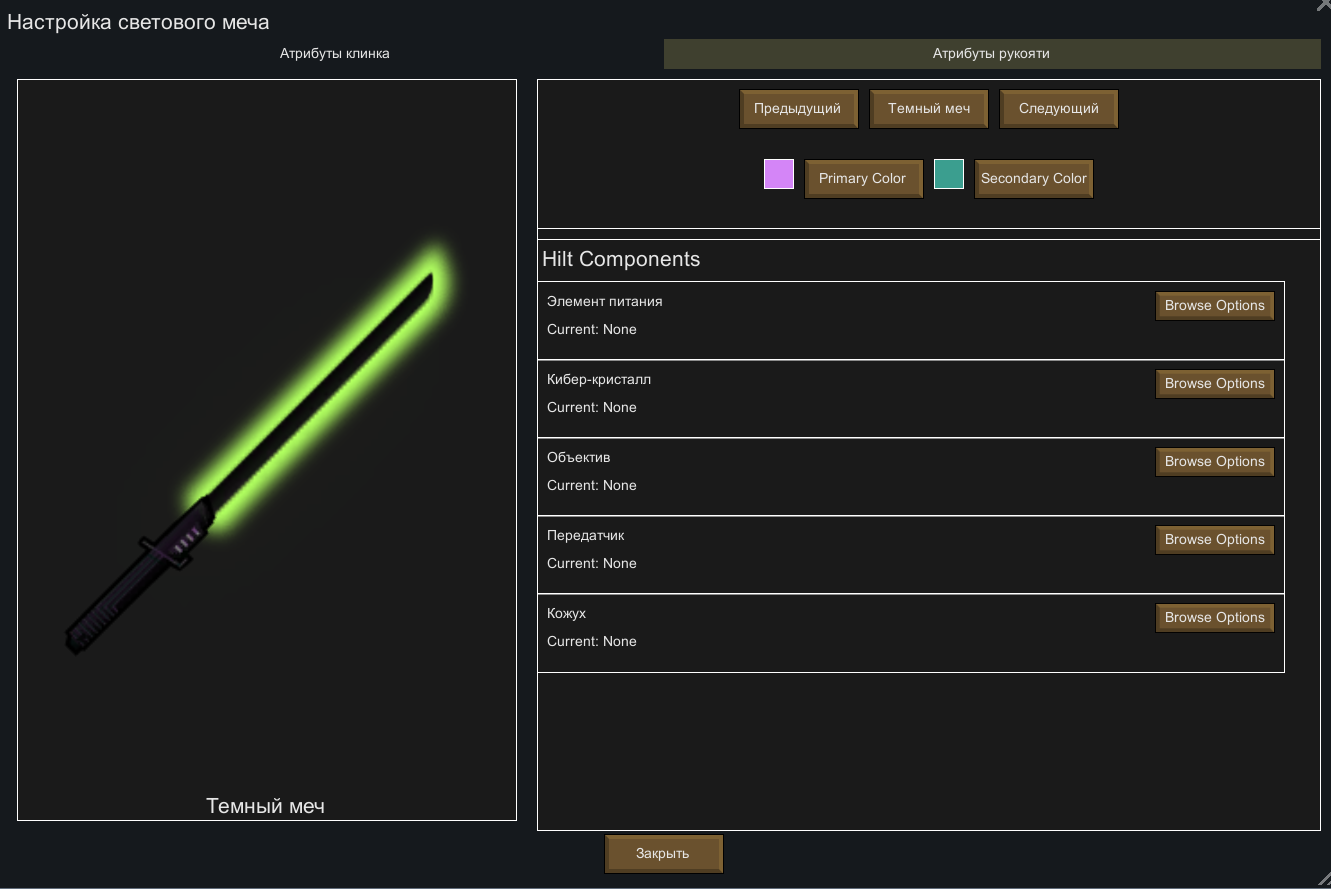 Выбирайте из более чем 50 вариантов дизайна рукоятей с 9 предустановленными цветами на выбор. Или выберите пользовательский цвет с помощью встроенного в игру RGB-селектора. Возможности безграничны. Недавно добавлена система компонентов. Теперь добавлено 5 новых категорий, каждая из которых может иметь свои уникальные статусные бонусы.