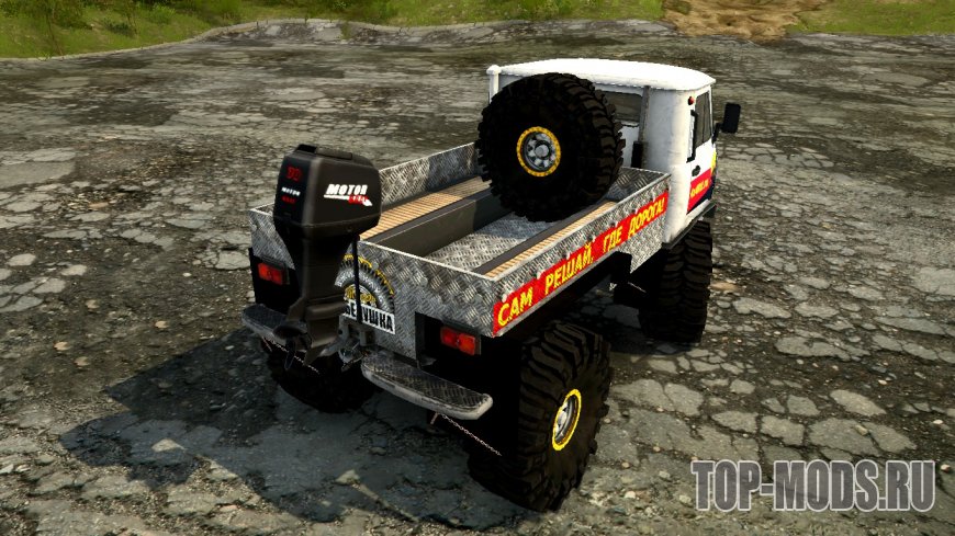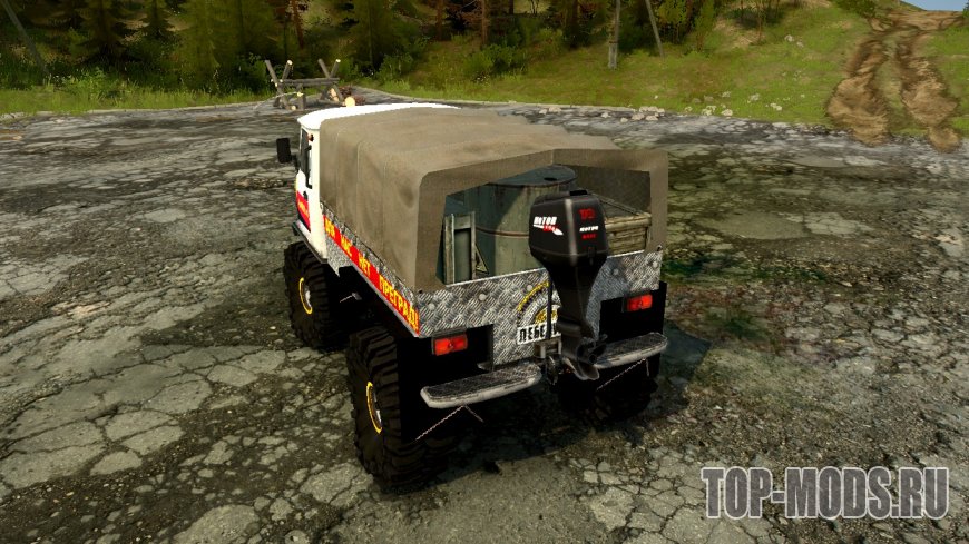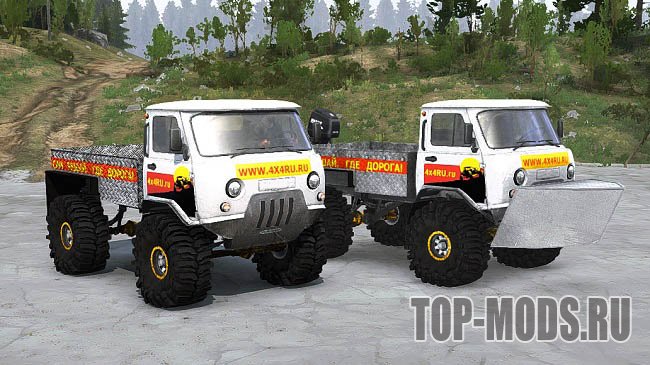 Пак из двух Уазов. Один из них имеет режим лодки (у него сзади лодочный мотор). Находясь в воде просто включите полный привод и он поплывет. На любых других поверхностях выключайте полный привод. Если Вы переключаете полный привод на бездорожье, не в воде, остановите грузовик, выключите и затем поезжайте.