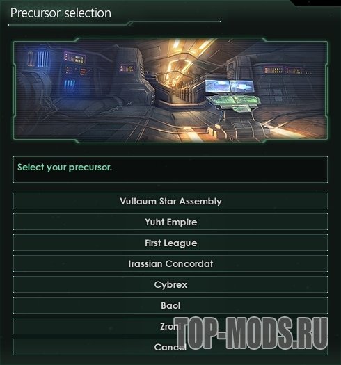 Этот мод добавляет указ, который открывает экран выбора, где вы можете выбрать прекурсора.
