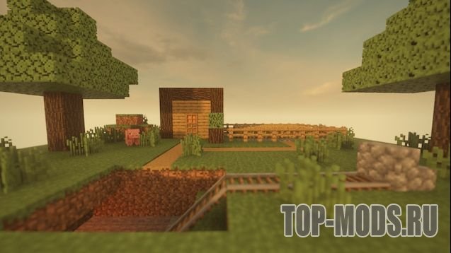 Небольшой уровень песочницы, представляющий minecraft. С небольшим домом, фермой, шахтой и пещерой с рудами для добычи.