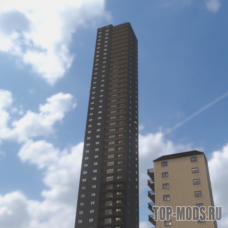Дома проработанные + работает лифт чтобы подняться на этаж есть табло с кнопками нажмите на Е.Комнаты с декором присутствуют диваны компы, и телевизоры. 4 жилых небоскрёба их можно убрать если лагает + есть паркинг на карте и немного дороги.2 машины один додж челенджер, а второй чёрный седан.