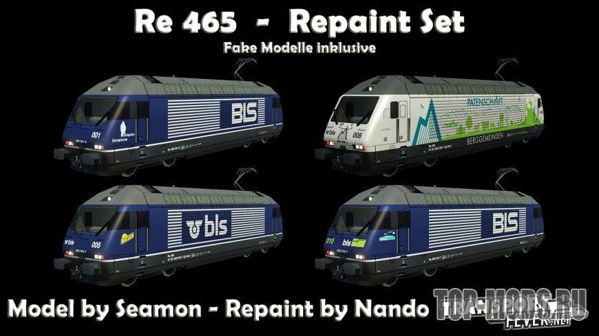 Модификация добавляет в игру локомотив 4 Re 465 в цветах Bern-Lötschberg-Simplon-Bahn, известных как BLS. Как обычно, локомотивы сгруппированы в депо, они могут быть отключены по отдельности. Можно отредактировать в файле «settings.lua».