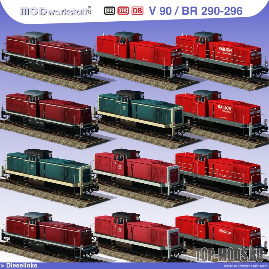 Мод пак немецких маневровых тепловозов для игры Transport Fever 2. Доступны следующие модели: Class 290 / 291 / 294 / 295 / 296. Также включает в себя ливрею частной компании.